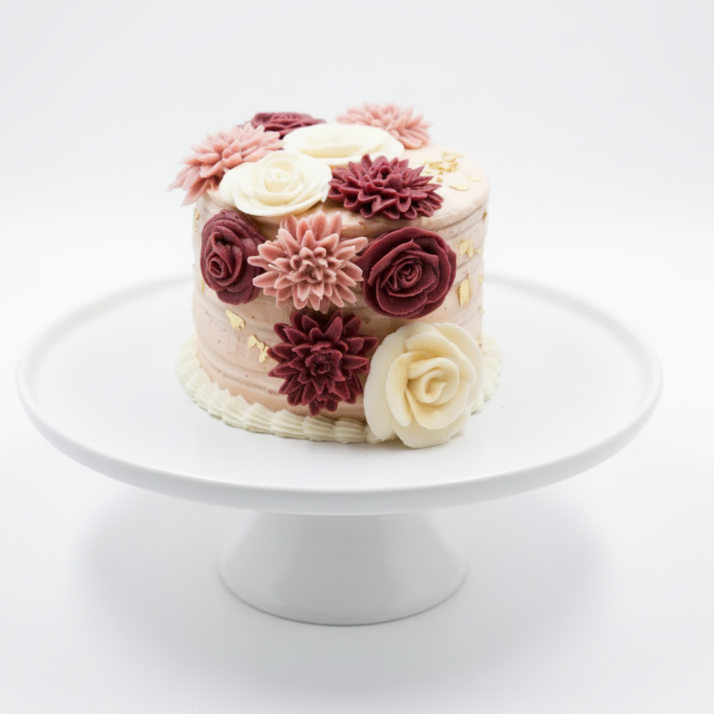 Soft blush, ivory, and deep berry blooms are delicately dusted with edible gold, creating a timeless, romantic finish.